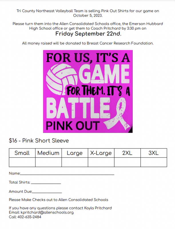 Tri County Northeast Volleyball Team is selling Pink Out Shirts for their game on