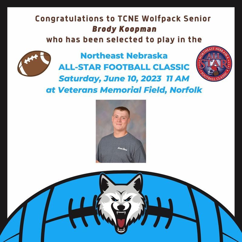 Congratulations to TCNE Wolfpack Senior, Brody Koopman, on being selected to play in the 2023 Northeast Nebraska All-Star Football Classic. The game will be held on Saturday, June 10, 2023 at Veterans Memorial Field in Norfolk. Kickoff is set for 11:00 A.M.. Koopman will be playing on the Red Team along with other area Northeast Nebraska athletes coached by Mark Brahmer of Pierce, along with Red staff Jeff Bellar from Norfolk Catholic, Carl Scholting from Pierce, Tom Allen from Crofton, Tyler Legate from Pierce and Tim Kassmeier of Norfolk Catholic. Good luck Brody!
