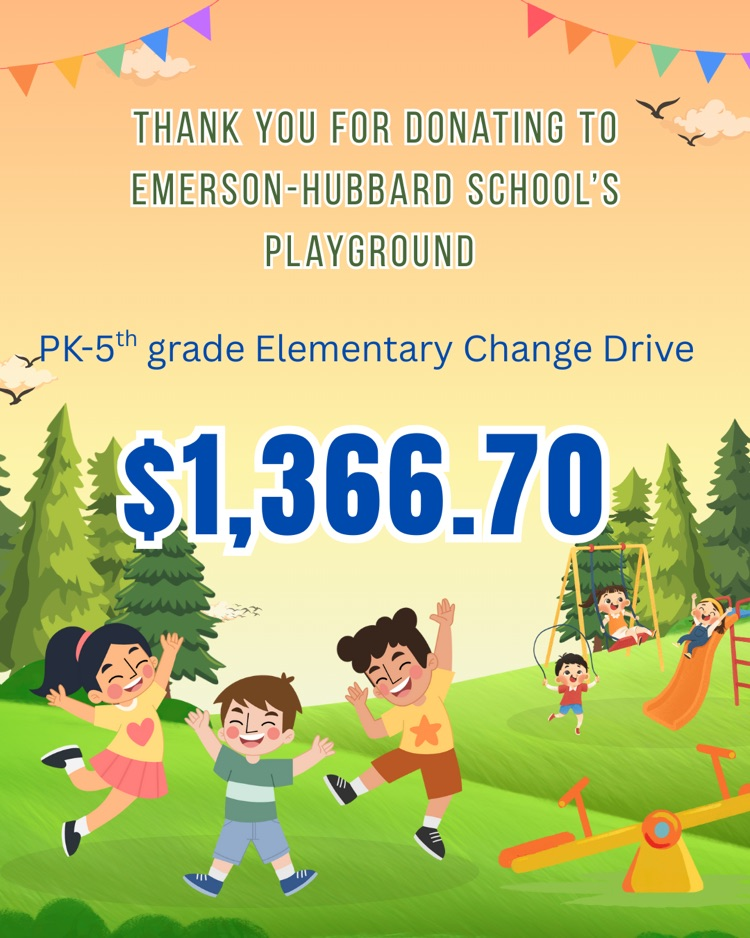 Thank you, elementary students, for your generosity and hard work. Together they raised an amazing $1,366.70 during our change drive to support the new elementary playground!