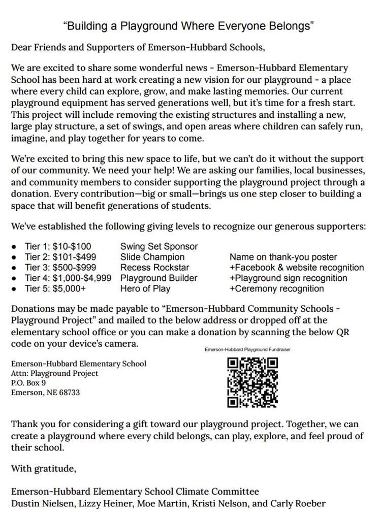 On this Giving Tuesday, Emerson-Hubbard Elementary School is asking our community to help us build a brand-new playground for our students. Your generosity will create a safe, fun, and inspiring space to play every day. Any contribution, big or small, makes a meaningful difference.